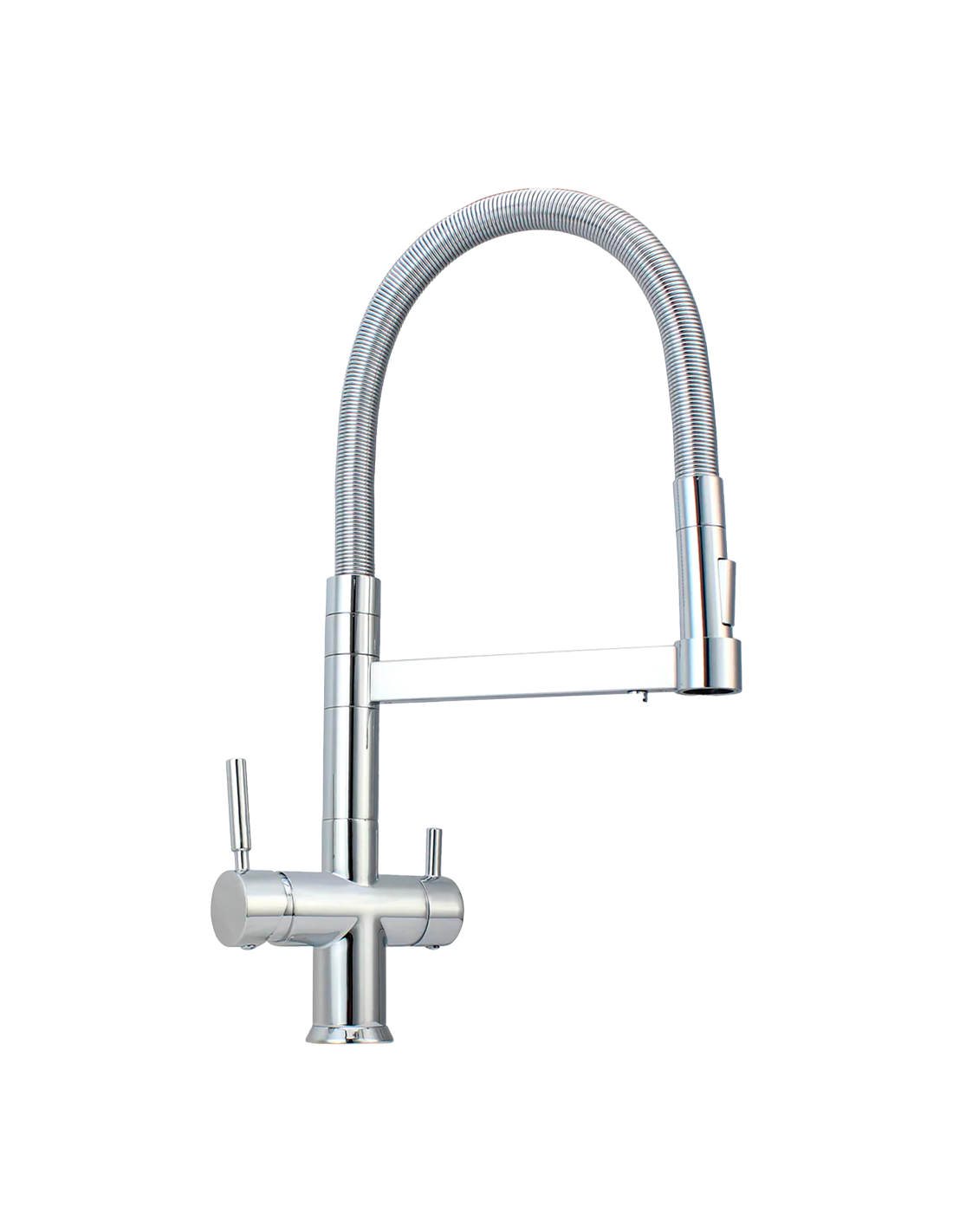 The 3-way pull-out faucet is designed to distribute reverse osmosis water and regular tap water from a single faucet while maintaining complete separation between the two circuits.
