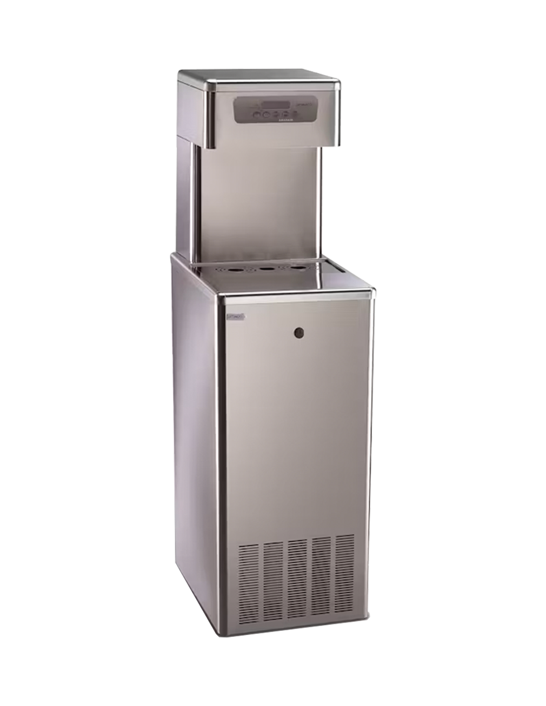 The DOMOREF water fountain is a high-capacity floor-standing unit capable of delivering up to 180 L/h of chilled or ambient water. Designed for large shared environments, it can supply drinking water for up to 240 users.